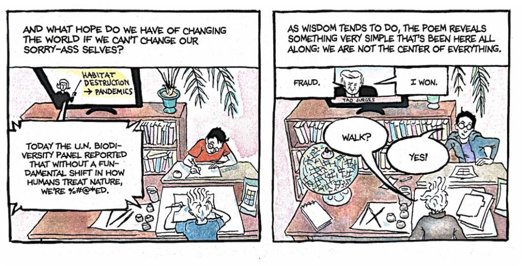 Unlike many of the works by authors I discuss on this site (Hesse, Achebe, Morrison, Vonnegut, et al.), Bechdel’s Fun Home does not explicitly evoke “wisdom” or its variants. Elsewhere, she occasionally invokes the concept in the title of represented volumes: depicting the pathbreaking lesbian journal “Sinister Wisdom” in the Cartoonist’s Introduction to her 2008 collection The Essential Dykes to Watch Out For and that of Christiane Northrup’s The Wisdom of Menopause in her 2021 The Secret to Superhuman Strength (xiif., 192). A notable page in the latter quotes from Adrienne Rich’s poem “Transcendental Etude” about the need not to transcend the world, as Wordsworth sought to do in his Immortality ode, but rather to transform it, “here, and now” (Secret 231). The page then ends on a frame depicting Bechdel and her wife Holly at their respective work stations while, in the background, a television shows Donald Trump saying “Fraud” and “I won”—all beneath a caption that reads: “As wisdom tends to do, the poem reveals something very simple that’s been here all along: we are not the center of everything.”