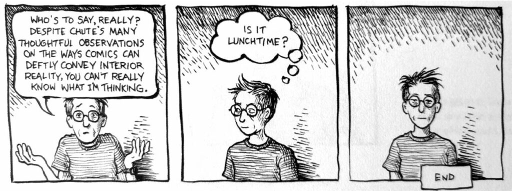 I read the final three panels of “Why Comics?” as making just this point. In the first, Bechdel raises her hands in a questioning gesture and playfully says: “Despite Chute’s many thoughtful observations on the ways comics can deftly convey interior reality, you can’t really know what I’m thinking.” In the second, we see her looking thoughtfully away under a thought bubble that asks: “Is it lunchtime?”. In the third, she simply looks straight at us. If wisdom requires that we not take ourselves too seriously “as the center of everything”—as the Trump-referencing panel in Secret invites us to do—then it is appropriate to ask whether the absence of self-mockery in both the generative AI essays and our work as literary critics does not mean that they, and we, fall short of wisdom as Bechdel sees it.