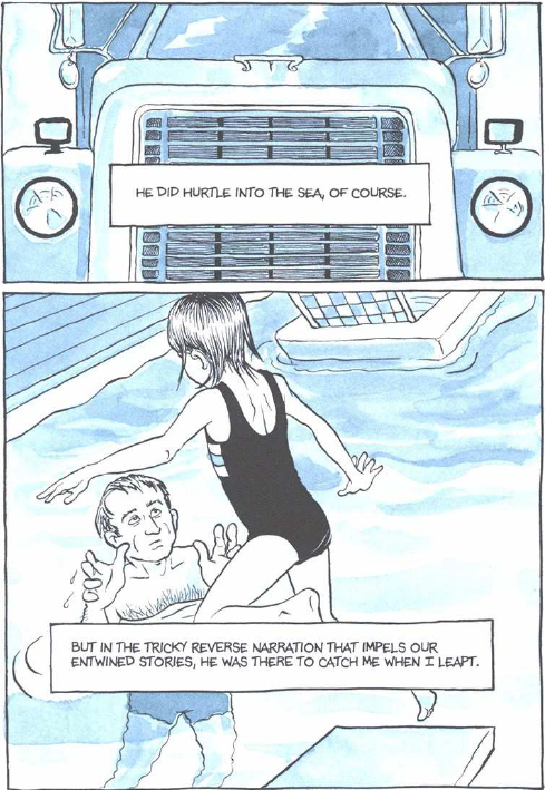 Hillary Chute, arguably the doyenne of Bechdel criticism, has written cogently of the ways in which Bruce Bechdel, “as cruel and petty as he was,” served as “both a disabling and enabling force” for Alison in her development as an artist (207). In this, Chute specifically references Fun Home’s final page, which juxtaposes a spare close-up of the grill of the truck that killed Bruce Bechdel with the final image of a young Alison leaping off a diving board into her father’s arms, under the caption that “he was there to catch me when I leapt” (Fun Home 232).